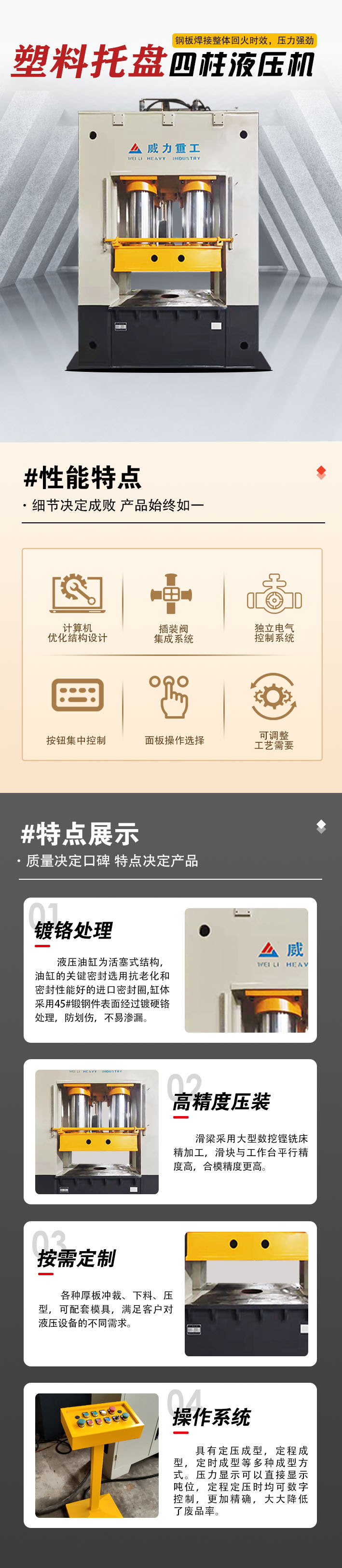 【產(chǎn)品描述】:塑料托盤成型液壓機(jī)是一種專門用于生產(chǎn)塑料托盤的設(shè)備。它采用液壓系統(tǒng),通過將熔化的塑料注入模具中,然后施加高壓力進(jìn)行成型,最終得到塑料托盤產(chǎn)品。這種機(jī)器具有高效、精準(zhǔn)、穩(wěn)定的特點(diǎn),能夠生產(chǎn)出高質(zhì)量的塑料托盤。 塑料托盤成型液壓機(jī)在物流、倉儲(chǔ)、包裝等行業(yè)中有著廣泛的應(yīng)用。塑料托盤是一種常用的物流包裝工具,可以用于存放、運(yùn)輸和堆放貨物,提高